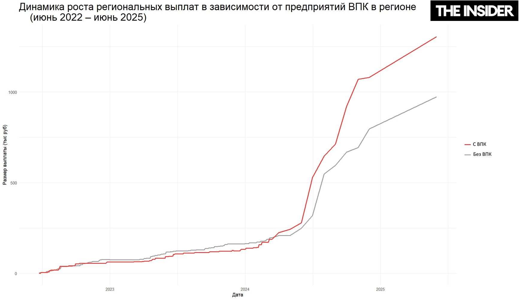 Судя по данным за июнь 2025 года, эта разница сохранилась. В регионах с оборонными предприятиями в декабре 2024 года выплаты были выше на 280 тысяч рублей, а в июне — уже на 330 тысяч. Это может говорить о том, что регионы с ВПК активнее вовлечены в вербовку военных, получают больше ресурсов или стремятся компенсировать конкуренцию за кадры между заводами и фронтом. То есть у регионов появилась новая специфика — участие в военной экономике.