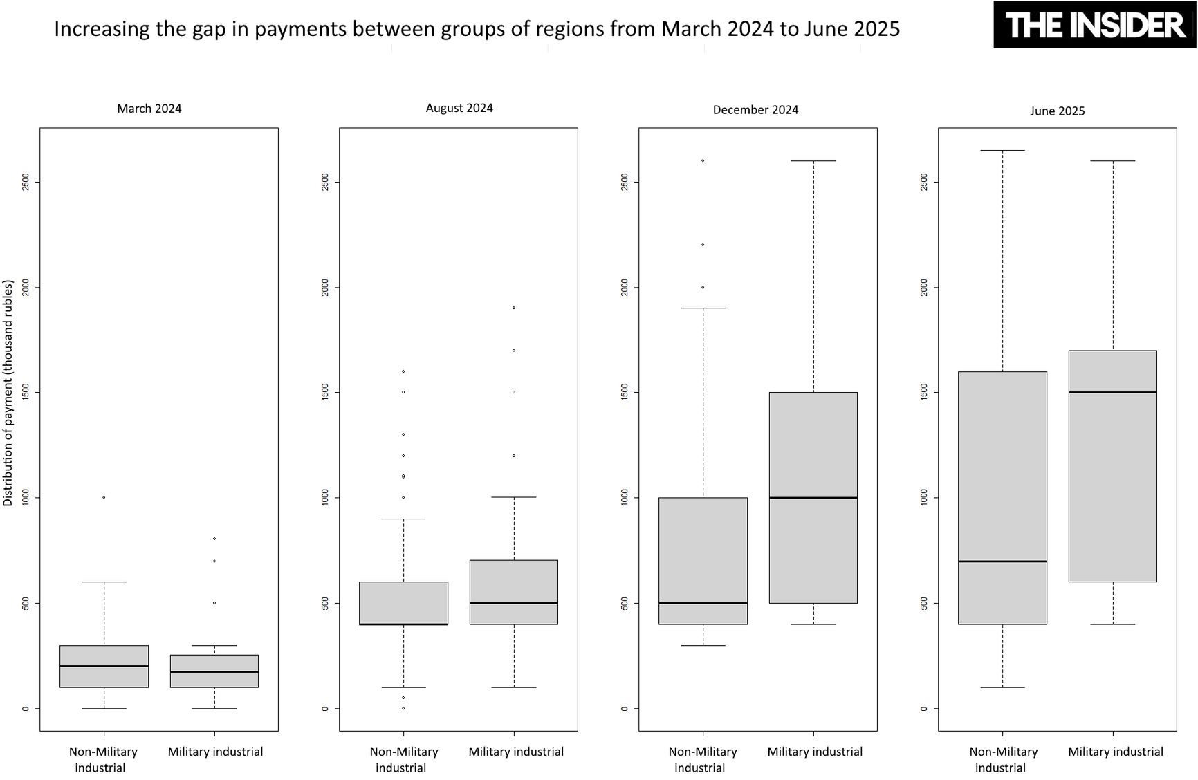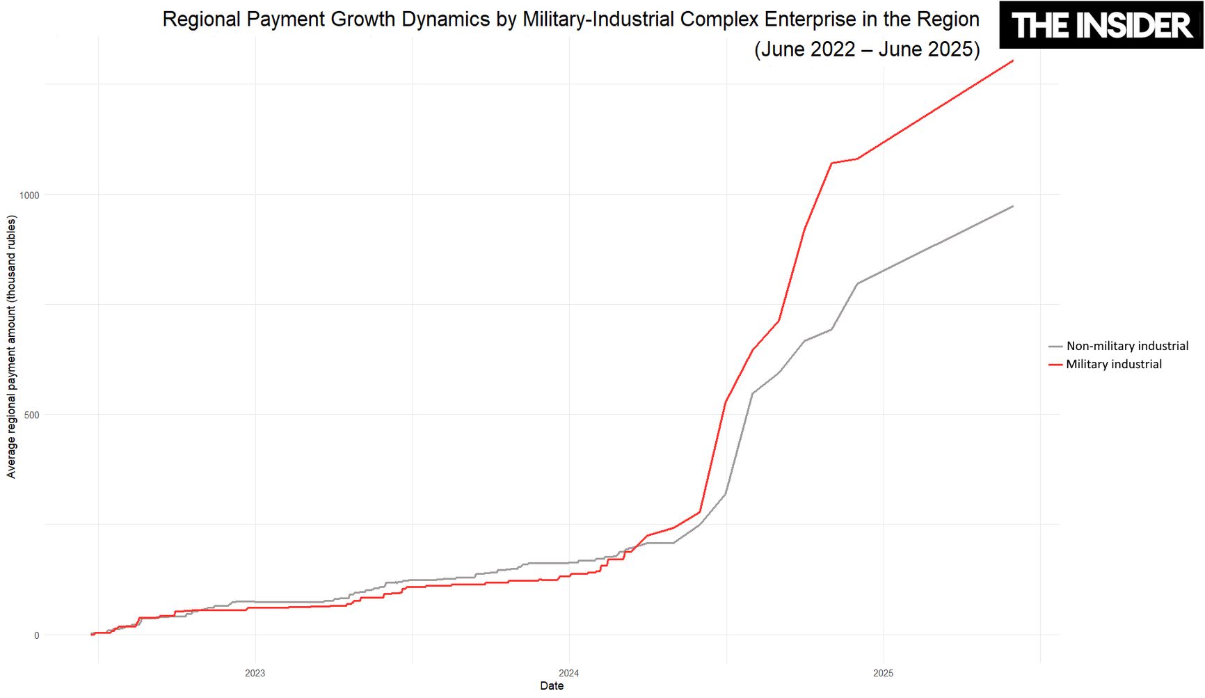 To test this hypothesis, we divided the regions into two groups — those with defense enterprises and those without. In early 2024, the difference between the two groups was barely noticeable. However, a divergence had emerged by August of that year, and by December, payouts in defense-oriented regions had become noticeably higher.