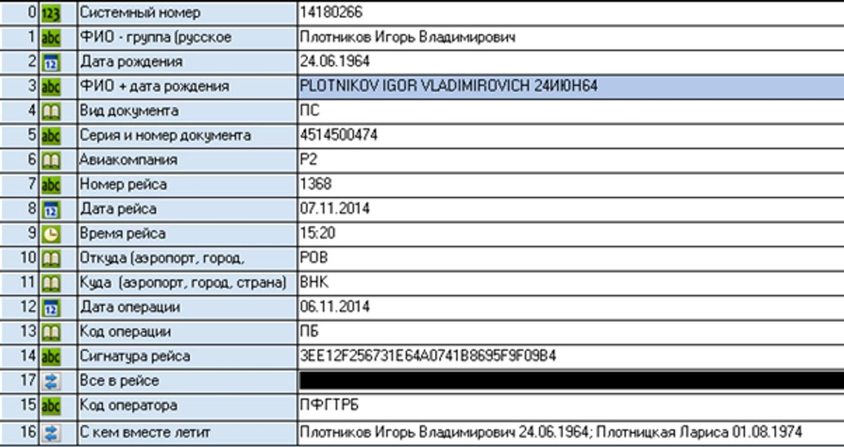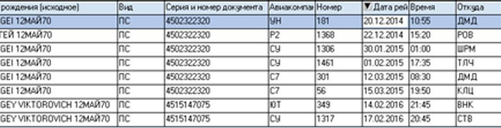 The flight database shows that on November 7, 2014, Plotnitskaya flew from Rostov-on-Don to Moscow with the Russian citizen Igor Vladimirovich Plotnikov, whose birth date is listed as June 24, 1964 - the same date as Plotnitsky's. The exact reason for this trip is unknown, but it is noteworthy that Plotnitsky had been appointed head of the «LNR» only three days before. In addition, flight records indicate that his then-colleague Alexander Zakharchenko, who was sworn in as head of the «DNR» on the same day as Plotnitsky, also flew from Rostov-on-Don to Moscow shortly after the inauguration, which also suggests that those trips were most likely business trips.
