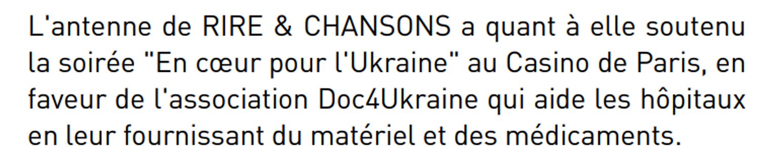Французская NRJ Group, выдающая лицензию российскому «ГПМ Радио», в своем годовом отчете за 2023 год подчеркивает поддержку Украины. Например, принадлежащая NRJ Group радиостанция Rire & Chansons организовала благотворительный вечер ”En cœur pour l'Ukraine“ в Париже. Собранные средства были направлены ассоциации Doc4Ukraine, которая оказывает помощь украинским больницам, детским домам и домам престарелых в зонах боевых действий.