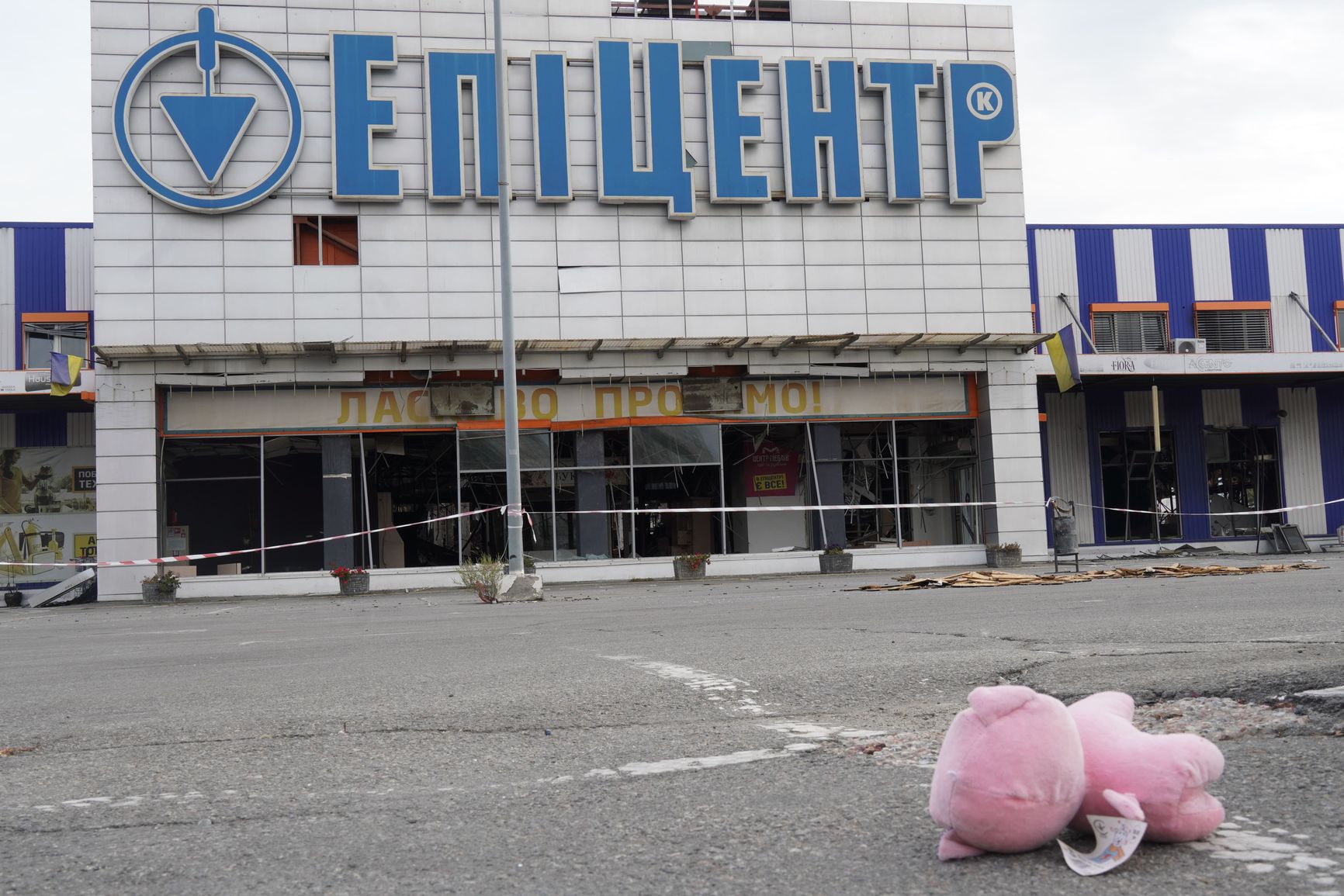 У входа в гипермаркет харьковчане устроили импровизированный мемориал: прикрепили к фонарному столбу фотографии погибших в результате массовой атаки работников и посетителей магазина, принесли туда лампадки и гору плюшевых игрушек. Иногда игрушки разбрасывают по парковке порывы ветра, но их каждый раз подбирает и относит назад к мемориалу охранник «Эпицентра» — тучный мужчина лет 60. Он охраняет не магазин, там вообще уже нечего красть — всё или было уничтожено взрывом, или сгорело в вызванном ракетным ударом пожаре. Он следит за тем, чтобы зеваки не залезли внутрь.