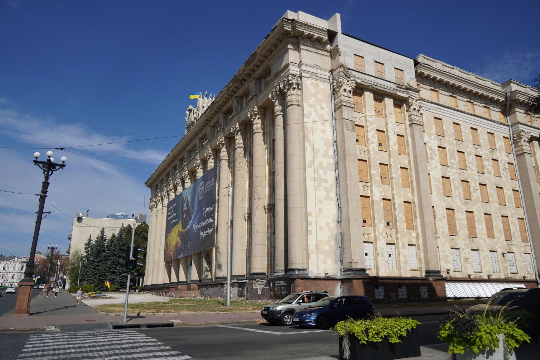 По нынешним временам это не просто неуместные, а по-настоящему кощунственные слова — напротив университета расположено здание Харьковской областной администрации, в котором одним ракетным ударом 1 марта 2022 года было убито 44 человека. За частично разрушенным зданием администрации расположено еще несколько серьезно пострадавших жилых домов и офисных строений.